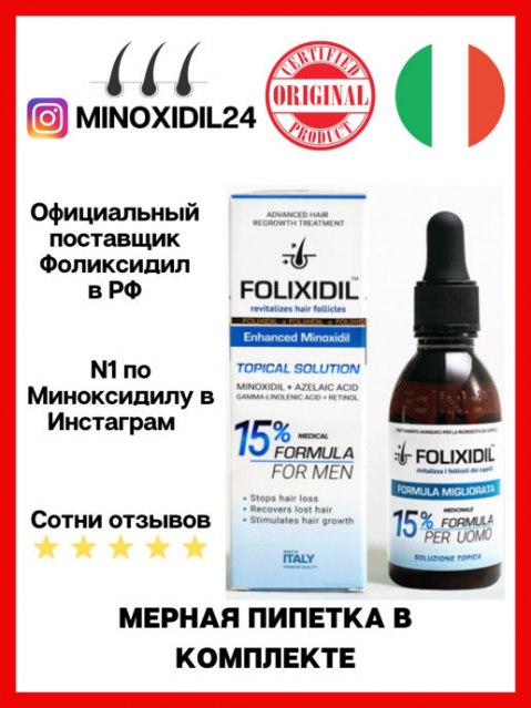 Миноксидил 15 % Folixidil - лосьон для роста волос и бороды. Усиленная формула миноксидила от всех видов выпадения волос (облысения) и для восстановления роста волос на залысинах. Содержит ретинол, азелаиновую и гамма-линоленовую кислоту, что повышает эффективность в сравнении со стандартными лосьонами миноксдила (Киркланд, Регейн, Алерана, Генеролон и др.) 15% формула предназначена для средних и поздних стадий облысения. И втом числе очень эффективна для роста густой бороды. Производится по самым высоким европейским стандратам качества в Италии.